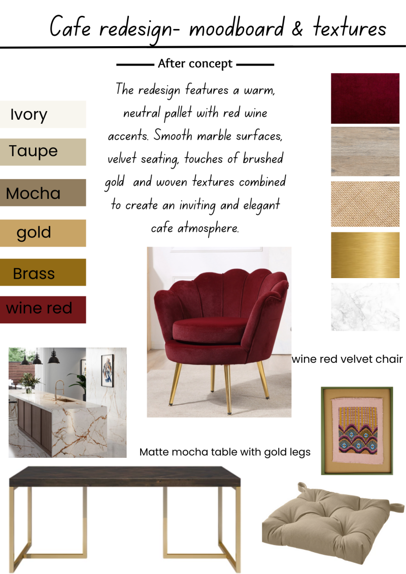 I created this mood-board to explore an elegant cafe redesign that feels inviting but still modernized . I chose a neutral base from my color pallet such as ivory, taupe and mocha to create the calm base, I then added wine red as the bold bright color to bring depth and warmth. The materials - marble , velvet , brushed gold and woven were perfect textures to balance luxury with comfort so the space feels more welcoming than formal.