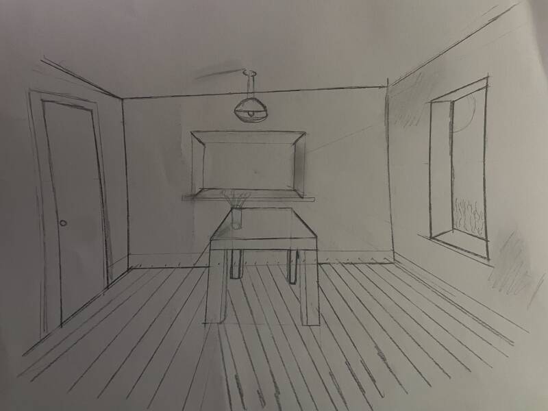 My first attempt was not too good, the lines were not straight and it all looked wonky and not too much like one point perspective , specifically the door, window and floor tiles ,I shaded it to try make it look better but it still wasn't great I did however like the table.