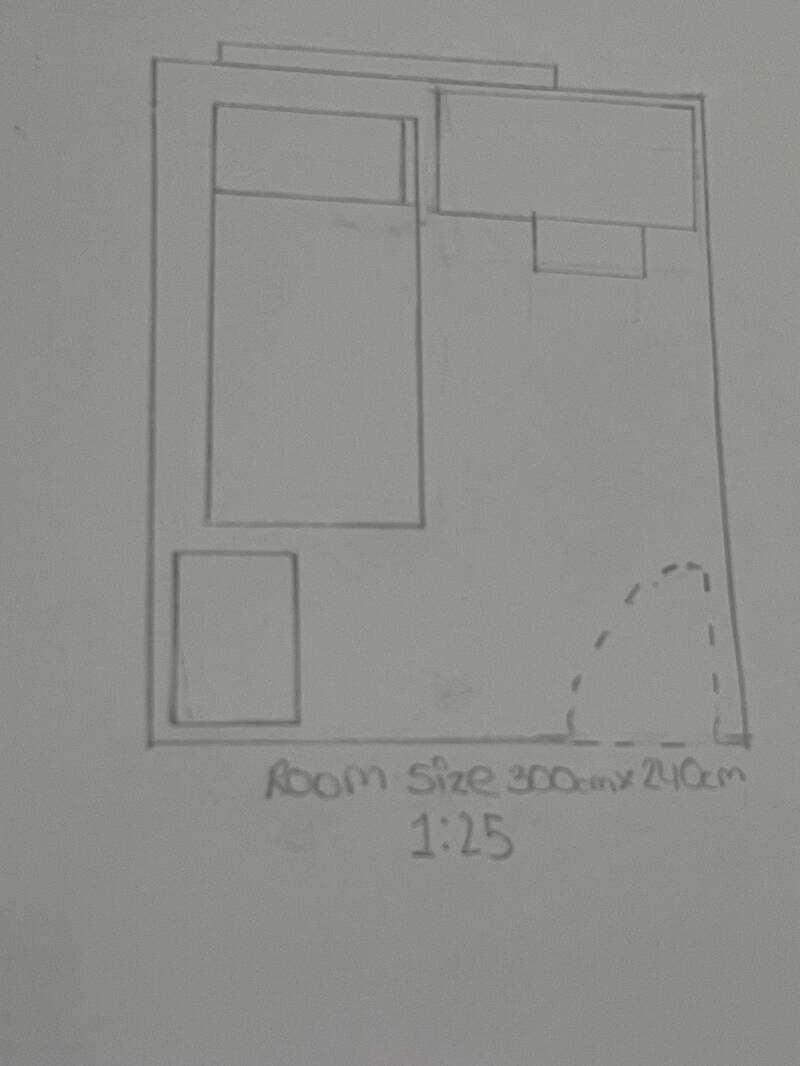 I sketched out a floor plan of a typical uni room with a typical rental room size being 9.84 x 7.87ft, the floor plan has been produced at a scale of 1:25, where 1 cm on the drawing represents 25 cm in real life. All furniture sizes were calculated by multiplying the scaled measurements by 25. The bed measures 190 cm × 85 cm, the desk measures 120 cm × 60 cm, and the wardrobe measures 65 cm × 47.5 cm.